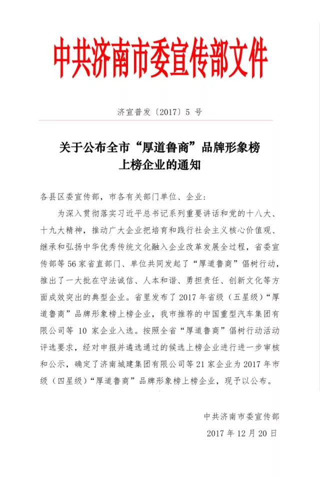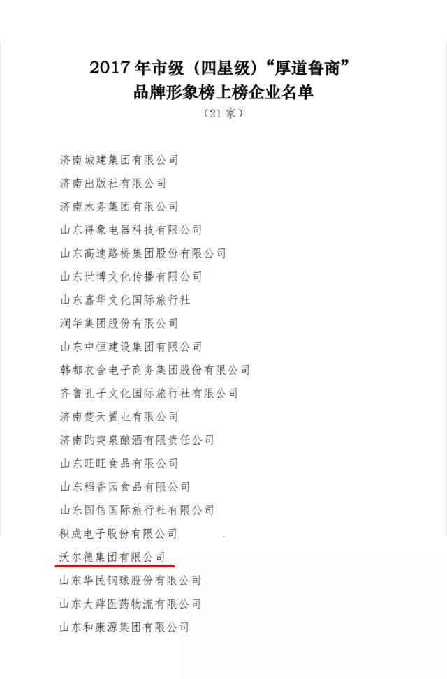2017年12月,中共濟南市委宣傳部公布全市“厚道魯商”品牌形象榜,沃爾德集團有限公司榜上有名,被成功評為濟南市2017年市級(四星級)“厚道魯商”品牌形象榜上榜企業(yè)。
