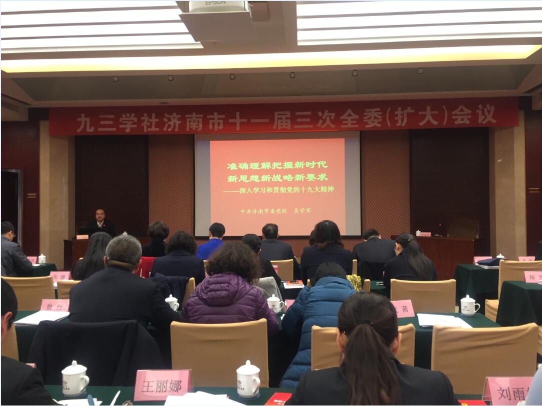 同時,會議邀請中共濟(jì)南市委黨校教授吳學(xué)軍作了題為《準(zhǔn)確理解把握新時代新思想新戰(zhàn)略新要求——深入學(xué)習(xí)和貫徹黨的十九大精神》的主題報告,從十九大召開的時代背景和我國發(fā)展新的歷史方位、習(xí)近平新時代中國特色社會主義思想與基本方略、新時代中國特色社會主義發(fā)展的戰(zhàn)略安排和部署、全面從嚴(yán)治黨不斷提高黨的執(zhí)政能力和領(lǐng)導(dǎo)水平等四個方面,對十九大精神進(jìn)行了深入的解讀,對社員們準(zhǔn)確把握、深刻領(lǐng)會中共十九大精神的豐富內(nèi)涵、精神實(shí)質(zhì)、核心要義起到了很好的促進(jìn)作用。