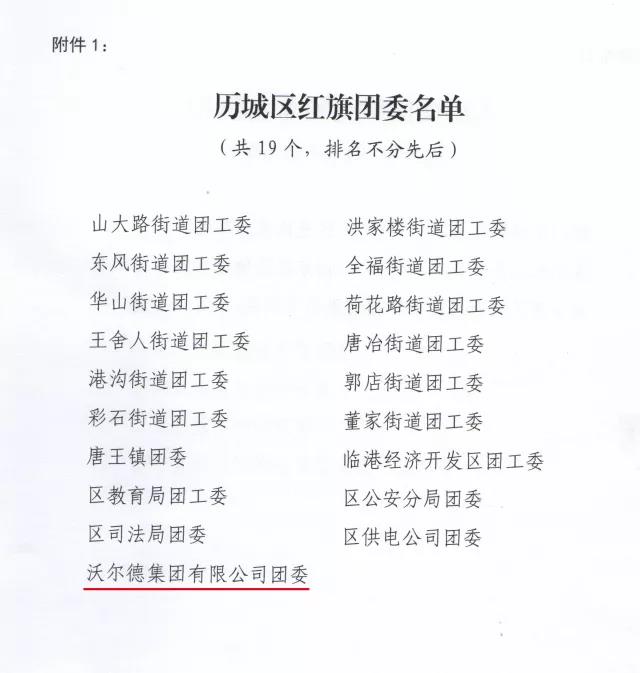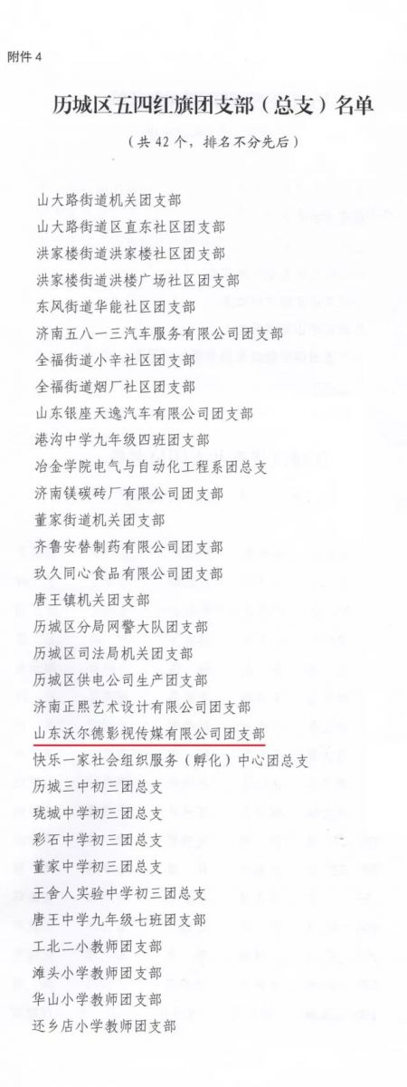 其中沃爾德集團團委被授予“歷城區(qū)紅旗團委”榮譽稱號、“山東沃爾德影視傳媒有限公司團支部”被授予“歷城區(qū)五四紅旗團支部(總支)”稱號。除了以上集體稱譽的之外,還對先進個人典型作出表彰。沃爾德集團團委書記王亞菲、副書記楊帆二人榮獲“歷城區(qū)優(yōu)秀共青團干部”;集團團委委員杜艷茹榮獲“歷城區(qū)優(yōu)秀共青團員”;程倚天榮獲“歷城區(qū)優(yōu)秀青年志愿者”。