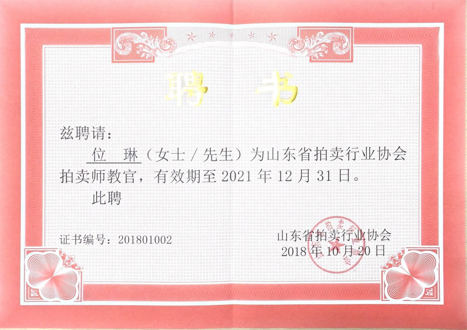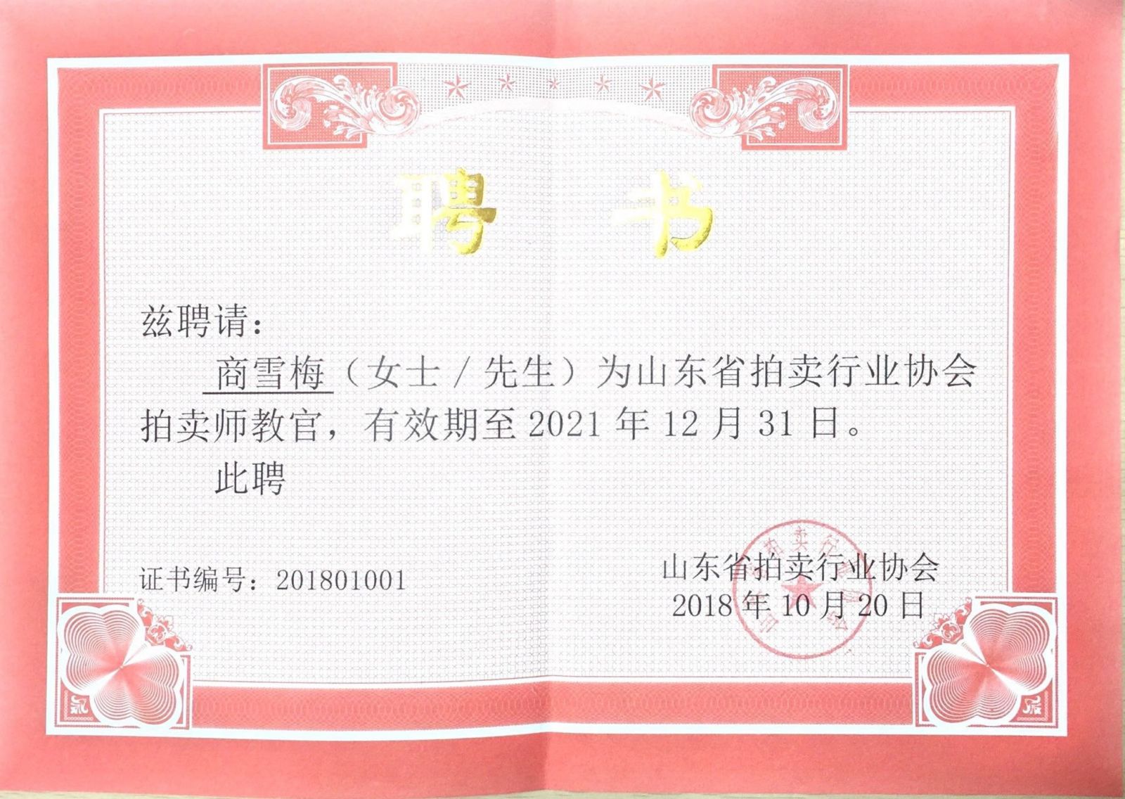 2018年10月20日,山東省拍賣師教官工作會議在泉城濟南順利召開。金諾國際拍賣有限公司董事長商雪梅、總經理位琳入選為山東省拍賣行業(yè)協(xié)會首批拍賣師教官,山東省拍賣行業(yè)協(xié)會會長李偉、山東省拍賣行業(yè)協(xié)會副會長、沃爾德集團董事長林擘分別向首批拍賣師教官頒發(fā)了聘書。