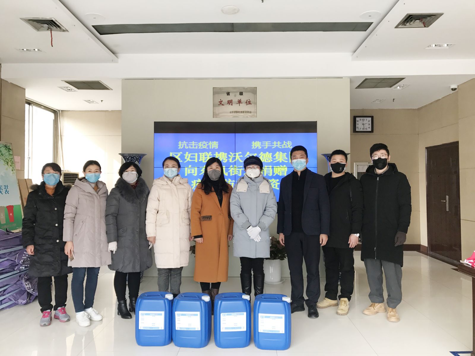 ●2月7日,在抗擊疫情的關(guān)鍵時(shí)刻,沃爾德集團(tuán)婦聯(lián)副主席、金諾國拍總經(jīng)理位琳及集團(tuán)代表,先后來到東風(fēng)街道、洪家樓街道、山大路街道、全福街道、郭店街道辦事處,代表集團(tuán)婦聯(lián)與歷城區(qū)婦聯(lián)一道,為基層送去消毒液防疫物資,為疫情防控保障貢獻(xiàn)巾幗力量。