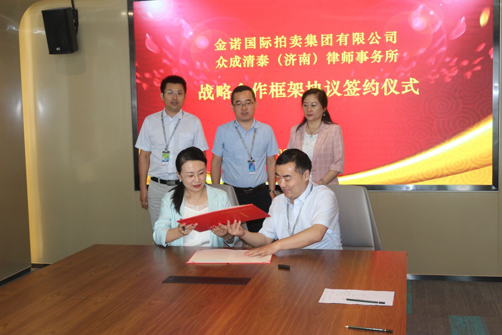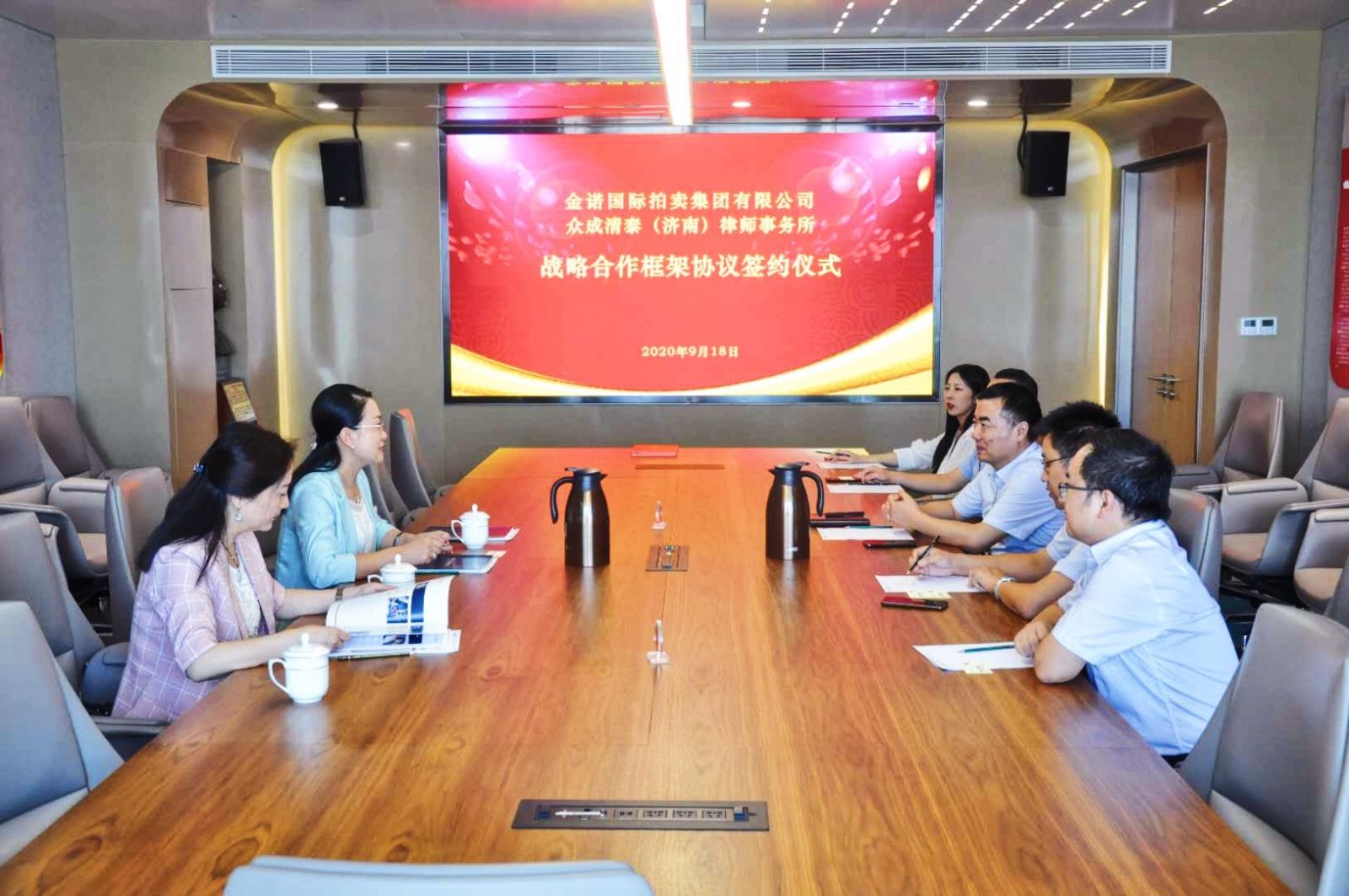 2020年9月18日,金諾國(guó)際拍賣集團(tuán)總裁位琳、副董事長(zhǎng)胡懷英一行赴山東眾成清泰(濟(jì)南)律師事務(wù)所,與高級(jí)合伙人唐向東副主任、馬士彬律師,合伙人許長(zhǎng)樂和李輝律師就不良資產(chǎn)處置、企業(yè)并購(gòu)及破產(chǎn)重組、投融資等業(yè)務(wù)領(lǐng)域全方位戰(zhàn)略合作進(jìn)行會(huì)談,并一起見證了雙方代表簽署戰(zhàn)略合作協(xié)議。