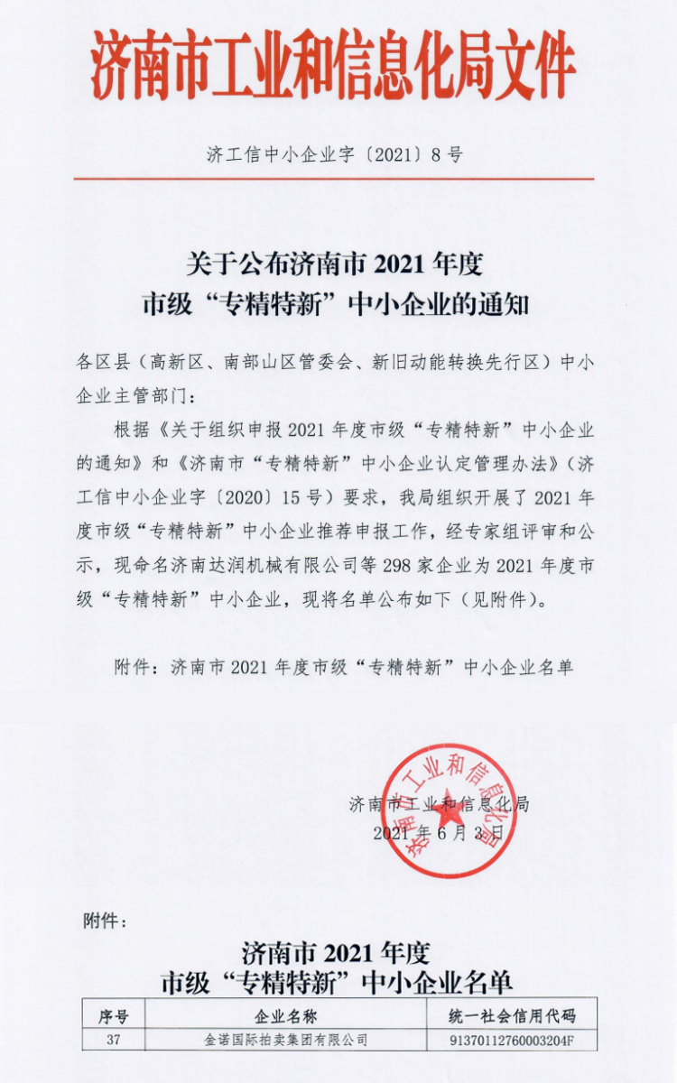 根據(jù)《關(guān)于組織申報(bào)2021年度市級(jí)“專精特新”中小企業(yè)的通知》和《濟(jì)南市“專精特新”中小企業(yè)認(rèn)定管理辦法》要求,我公司經(jīng)過企業(yè)信用評(píng)價(jià)、資料審核、評(píng)定指標(biāo)統(tǒng)計(jì)分析等多個(gè)環(huán)節(jié)審核,近日,濟(jì)南市工業(yè)和信息化局正式公布了2021年“專精特新”中小企業(yè)名單,金諾國際拍賣集團(tuán)有限公司憑借在企業(yè)創(chuàng)新發(fā)展方面的突出成就順利入選,被評(píng)為2021年度濟(jì)南市“專精特新”企業(yè)。