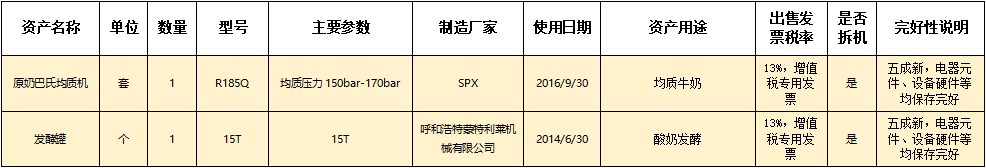 標的一:原奶巴氏均質機、發(fā)酵罐,起拍價格:9萬元(含稅,稅率見詳情表),標的設有保留價。