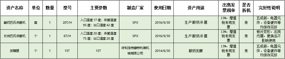 標的二:酸奶巴氏殺菌機、長效巴氏殺菌機、發(fā)酵罐,起拍價格:14萬元(含稅,稅率見詳情表),標的設有保留價。