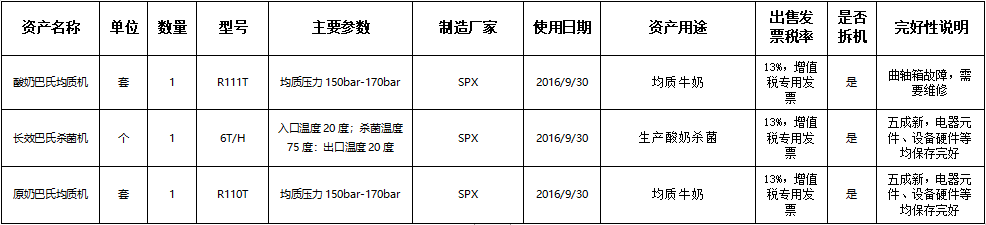 標的三:酸奶巴氏均質機、長效巴氏殺菌機、原奶巴氏均質機,起拍價格:15萬元(含稅,稅率見詳情表),標的設有保留價。