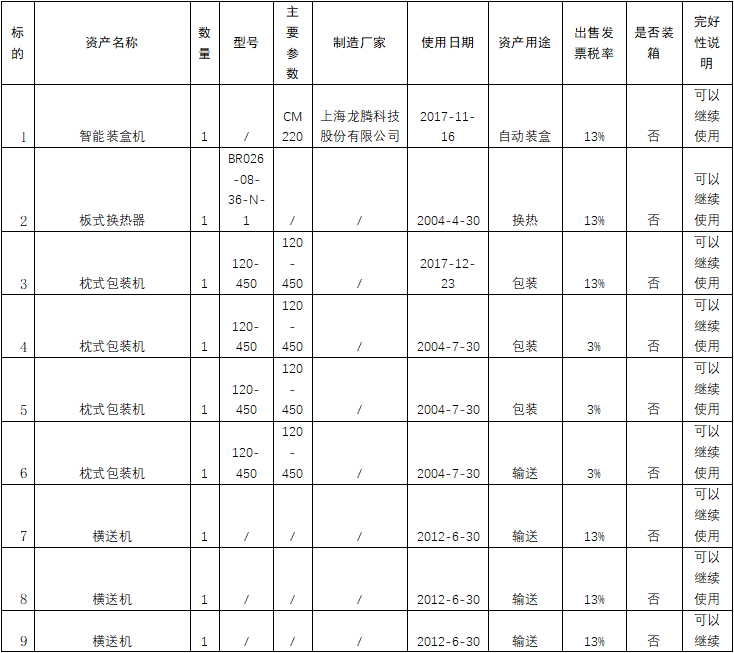 受委托,我公司將于2022年2月15日上午10 時(shí)在金拍網(wǎng)平臺(tái)https://www.jinpaiwang.com.cn以網(wǎng)絡(luò)競(jìng)價(jià)的方式公開(kāi)處置 智能裝盒機(jī)、枕式包裝機(jī)、橫送機(jī)、板式換熱器、分配盤、熱轉(zhuǎn)碼打印機(jī)等,標(biāo)的設(shè)有保留價(jià),標(biāo)的保證金為26萬(wàn)元,起拍價(jià)1276725元(含稅,稅率見(jiàn)詳情表);