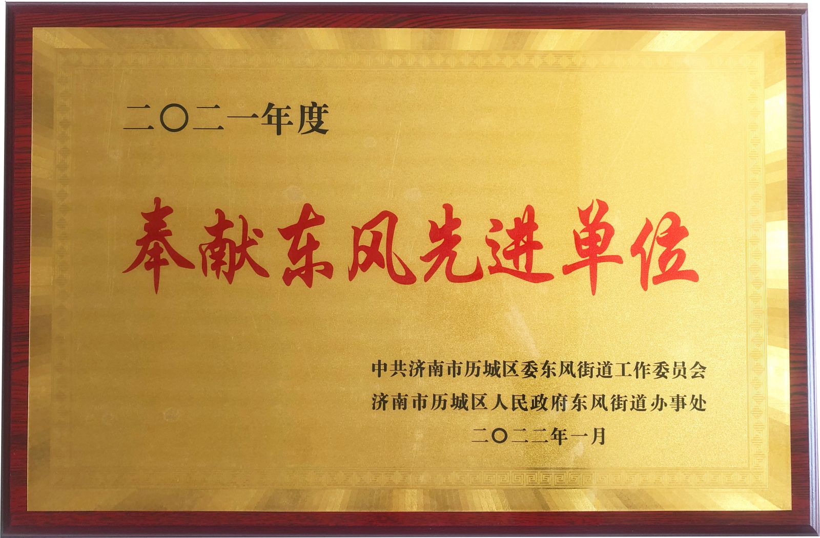 金諾國拍集團榮獲由中公濟南市歷城區(qū)委東風(fēng)街道工作委員會、濟南市歷城區(qū)人民政府東風(fēng)街道辦事處頒發(fā)的2021年度“奉獻(xiàn)東風(fēng)先進單位”榮譽稱號。