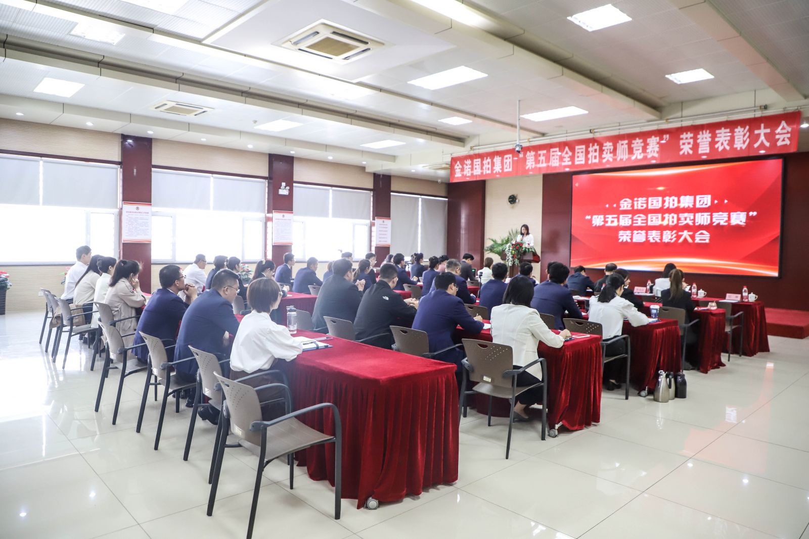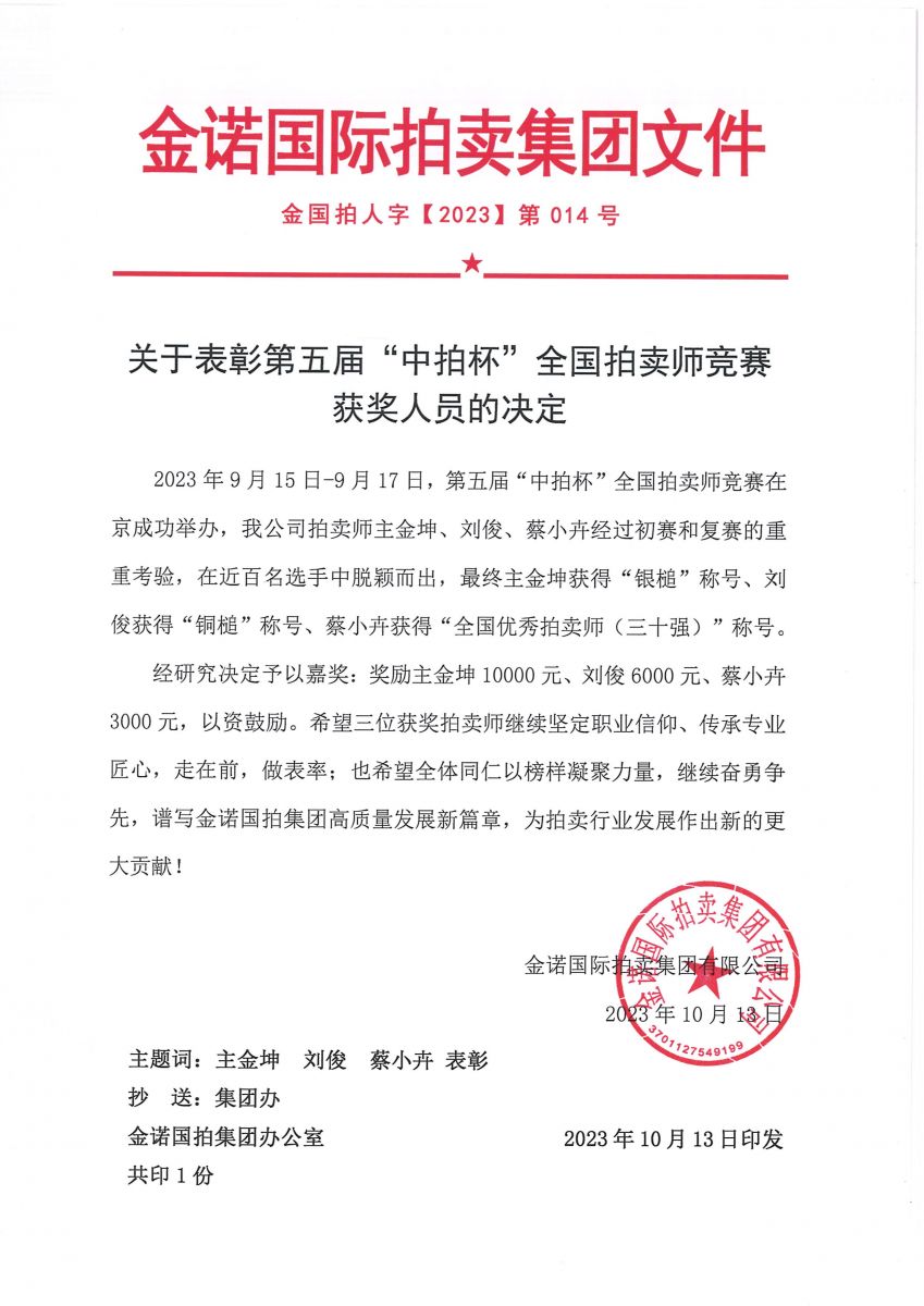 金諾國拍集團(tuán)總裁位琳首先宣讀了《關(guān)于表彰第五屆“中拍杯”全國拍賣師競(jìng)賽獲獎(jiǎng)人員的決定》,“經(jīng)研究決定予以嘉獎(jiǎng),希望主金坤、劉俊、蔡小卉三位獲獎(jiǎng)拍賣師繼續(xù)堅(jiān)定職業(yè)信仰、傳承專業(yè)匠心,走在前,做表率;也希望全體同仁以榜樣凝聚力量,繼續(xù)奮勇爭(zhēng)先,譜寫金諾國拍集團(tuán)高質(zhì)量發(fā)展新篇章,為拍賣行業(yè)發(fā)展作出新的更大貢獻(xiàn)!”