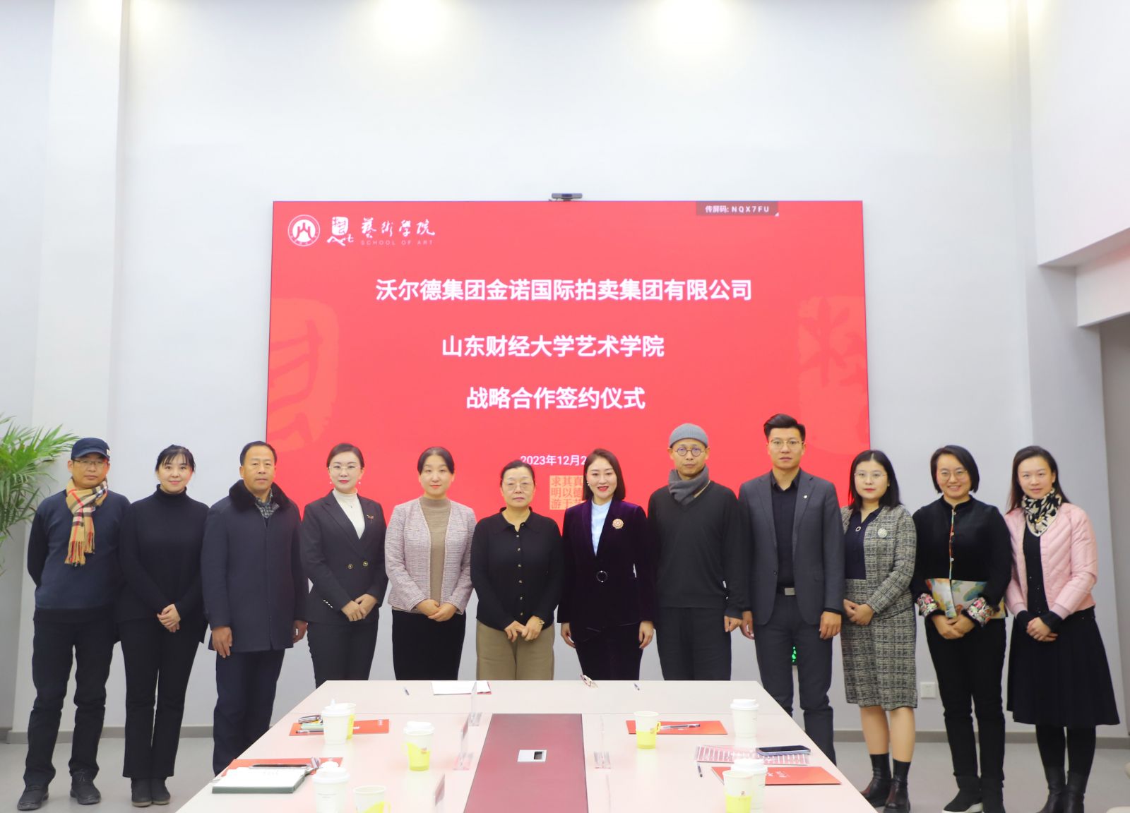 12月21日上午,山東財經(jīng)大學(xué)藝術(shù)學(xué)院與沃爾德集團、金諾國際拍賣集團有限公司戰(zhàn)略合作簽約儀式在山東財經(jīng)大學(xué)藝術(shù)學(xué)院會議室舉行。山東財經(jīng)大學(xué)副校長陳曉蘭、山東財經(jīng)大學(xué)藝術(shù)學(xué)院副院長(主持工作)宋述林、山東財經(jīng)大學(xué)藝術(shù)學(xué)院副院長袁慧敏出席簽約活動。山東財經(jīng)大學(xué)藝術(shù)學(xué)院黨委書記楊揚主持簽約儀式。沃爾德集團總裁、金諾國拍集團董事長、山東財經(jīng)大學(xué)99級金融專業(yè)校友商雪梅,金諾國拍集團總裁位琳,金諾國拍集團副總裁主金坤,金諾國拍集團總裁助理楊曉清參加本次活動并就雙方合作進行了深入交流。